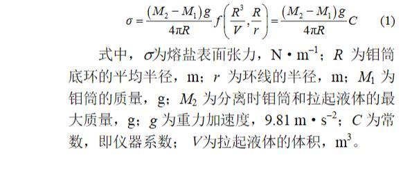 式中,σ為熔鹽表面張力,N·m?1;R為鉬筒底環(huán)的平均半徑,m;r為環(huán)線的半徑,m;M1為鉬筒的質(zhì)量,g;M2為分離時(shí)鉬筒和拉起液體的最大質(zhì)量,g;g為重力加速度,9.81 m·s?2;C為常數(shù),即儀器系數(shù);V為拉起液體的體積,m3。