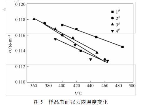 (4)隨著NaBr和KBr質量分數的升高和LiBr和CaBr2質量分數的降低,混合溴化鹽的表面張力曲線斜率先增大,然后又減小,在4種混合溴化鹽中,相同溫度下1#熔鹽樣品表面張力最大,4#最小。