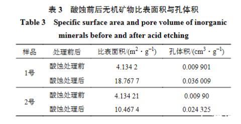 采用ASAP2460全自動比表面積與孔隙度分析儀測定采集無機礦物比表面積與孔隙體積。表3為多組分酸液酸蝕處理2種無機礦物前后測算結(jié)果。1號無機礦物酸蝕處理后比表面積增長4.539倍,孔體積增長約3.636 9倍;2號無機礦物酸蝕處理后比表面積增長2.418 8倍,孔體積增長2.457倍。因此酸蝕作用對無機礦物的溶蝕與解堵疏通作用顯著。