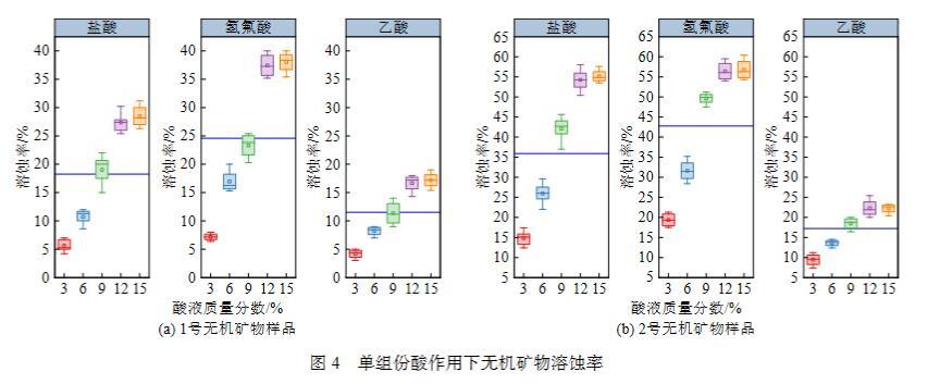 圖3為單組份酸作用下無機礦物溶蝕試驗記錄,圖4為無機礦物溶蝕率。由圖4可知,氫氟酸對2種無機礦物樣品溶蝕效果最佳,質(zhì)量分?jǐn)?shù)為15%的氫氟酸對1號無機礦物樣品的溶蝕率最高達(dá)40.2%,平均為37.3%;質(zhì)量分?jǐn)?shù)為15%的氫氟酸對2號無機礦物樣品的溶蝕率最高達(dá)59.5%,平均為56.6%。這是由于氫氟酸專適用于硅質(zhì)物等砂巖地層的酸化,氫氟酸對無機礦物的溶蝕速度很快,但是這會導(dǎo)致酸液作用時間短、酸化距離近的缺點。鹽酸溶蝕無機礦物能力較氫氟酸弱、較乙酸溶蝕能力強,質(zhì)量分?jǐn)?shù)為15%的鹽酸對1號無機礦物樣品的溶蝕率最高達(dá)31.8%,平均為27.7%;質(zhì)量分?jǐn)?shù)為15%的鹽酸對2號無機礦物樣品的溶蝕率最高達(dá)57.5%,平均為54.6%,可見鹽酸對無機礦物有較高的溶蝕率,且具有成本低、生成物可溶、氫離子濃度高的優(yōu)點。雖然乙酸較鹽酸與氫氟酸對無機礦物溶蝕率低的多,但是乙酸是有機酸,為弱酸,具有緩慢釋放氫離子的效果,具有緩速性起酸蝕緩速效果,可延長酸液有效距離。