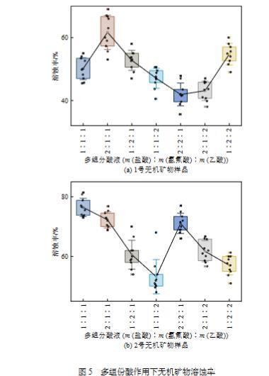 通過單組份酸溶蝕試驗,2種無機礦物樣品均呈現(xiàn)出酸液濃度越高溶蝕效果越好的趨勢,隨著酸液濃度逐漸增長,溶蝕率增長速率減緩。當(dāng)酸液質(zhì)量分?jǐn)?shù)超過12%時,無機礦物溶蝕效果變化不顯著。因此考慮酸液用量、價格、對煤基質(zhì)危險污染性等因素,選用質(zhì)量分?jǐn)?shù)為12%時的酸液溶蝕2種無機礦物樣品均為高性價比的選擇。