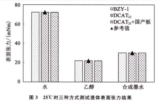 使用BZY-1表面張力儀(原配國產(chǎn)鉑金板)、表面張力儀(原配進(jìn)口鉑金板)和表面張力儀(選配國產(chǎn)鉑金板)對水、無水乙醇、合成墨水進(jìn)行表面張力測試,測試結(jié)果如圖3所示。
