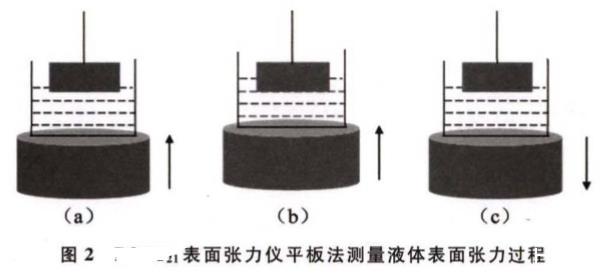 表面張力儀由德國Dataphysics公司研發(fā)并生產(chǎn),主要用于液體表界面張力及固體材料動(dòng)態(tài)接觸角的測定。液體表面張力的測定可以采用板法和環(huán)法兩種測量方法,其中板法基于Wilhelmy平板法測量原理,測量過程如圖2。