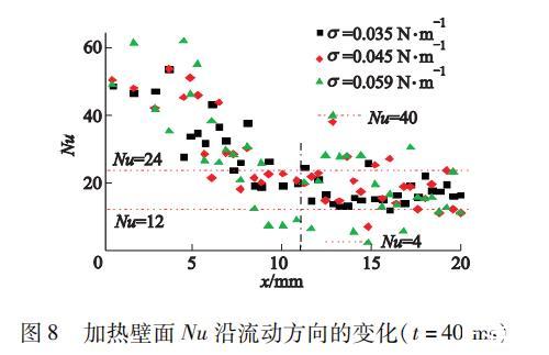 圖8加熱壁面Nu沿流動方向的變化(t=40 ms)