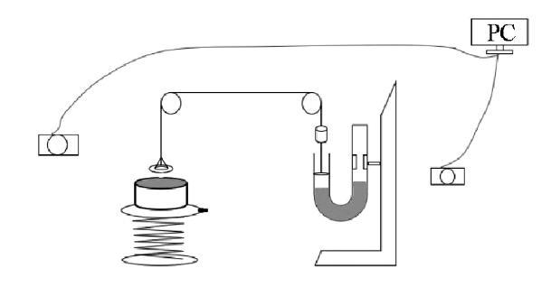 圖4為該實(shí)驗(yàn)裝置設(shè)計(jì)圖。該定量實(shí)驗(yàn)材料有U型管、砝碼(與金屬吊環(huán)一樣重)、活塞(與U型管內(nèi)徑相吻合且質(zhì)量極小)、定滑輪、升降臺和水槽、兩個(gè)數(shù)碼相機(jī)。其中一個(gè)相機(jī)用于錄像U型管示數(shù)變化,另一個(gè)相機(jī)用于觀察吊環(huán)形成水膜的狀態(tài)。最終兩個(gè)相機(jī)的圖像傳輸至PC端便可準(zhǔn)確讀出水膜在對應(yīng)狀態(tài)下U型管液面高度的示數(shù)。
