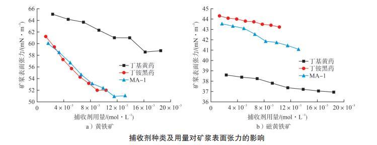 為研究捕收劑種類及用量對礦漿表面張力的影響,將黃鐵礦與磁黃鐵礦配成 30%濃度的礦漿,起泡劑2號油用量3×10?? mol/L、粒度-0.074 mm占比80%、pH=7,改變捕收劑種類及用量以測定礦漿表面張力。