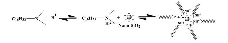 首先,在燒杯中加入1.0 g的Nano-SiO2,加入去離子水至100 g,搖晃混合1 min,超聲(200 W)分散1 h,使Nano-SiO2均勻分散在去離子水中,制得Nano-SiO2質(zhì)量分?jǐn)?shù)為1%的分散液,平均分成兩份各50 g。然后,在另一燒杯中加入2.0 g的C16A,加去離子水至100 g,搖晃混合溶解,得到100 g的C16A質(zhì)量分?jǐn)?shù)為2%的水溶液,平均分成兩份各50 g,其中一份使用質(zhì)量分?jǐn)?shù)為3.6%的鹽酸調(diào)節(jié)其pH=4.5,另一份不處理(pH為7.5)。將兩份C16A水溶液(pH=4.5、7.5)分別與Nano-SiO2分散液混合,放置30 min至平衡穩(wěn)定,制成C16A-SiO2降黏劑溶液。最后,將兩份C16A-SiO2降黏劑溶液離心,用去離子水洗2次、乙醇洗2次,在60℃烘箱中烘干24 h,即得pH響應(yīng)型稠油降黏劑(C16A-SiO2),分別記為 C16A-SiO2 (pH4.5)、 C16A-SiO2 (pH7.5)。