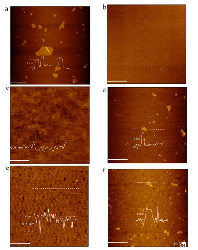 圖 5. 新鮮切割的云母表面上的 AFM 圖像(比例尺 = 1 μm):(a)干燥后的一滴 GO 分散體; (b) LB的對照實驗 在空氣-GO 水界面沒有脂質沉積的薄膜; (c) 從空氣-純水界面轉移的 DODAB LB 薄膜; (d) LB膜 從空氣-GO水界面轉移的DODAB; (e) 從空氣-純水界面轉移的 DSEPC LB 薄膜; (f) LB膜 DSEPC 從空氣-GO 水界面轉移。 所有脂質 LB 膜都在 20 mN/m 的恒定表面壓力下轉移。