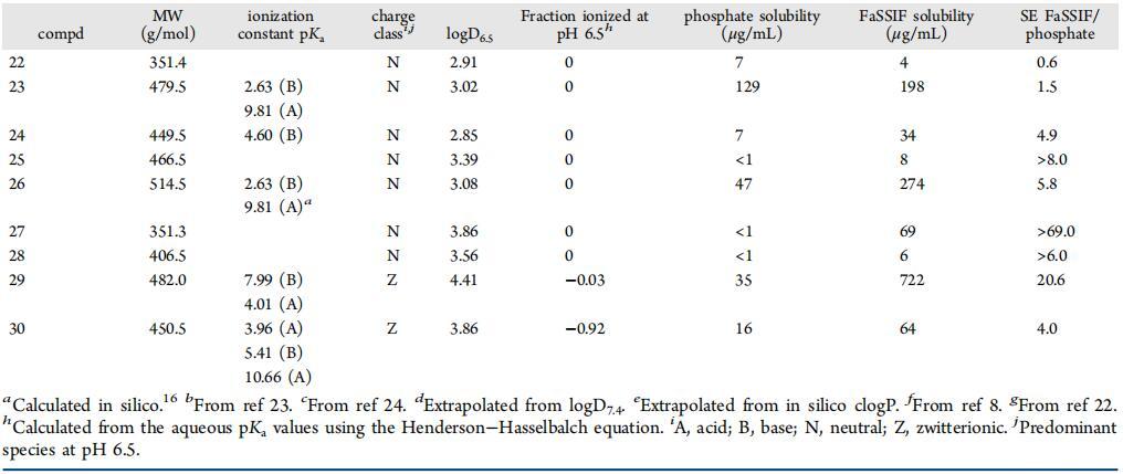 以前曾使用一組參考化合物觀察到,電離酸性化合物的硒通常低于電離堿。結果表明,由于與帶負電荷的FaSSIF介質組分之間的靜電排斥作用,離子酸在FaSSIF中的溶解度沒有增加。8在目前的研究中,對于幾個涵蓋更廣泛化學空間的專利化合物,我們沒有發(fā)現離子化酸或堿之間硒的任何顯著溶解度差異,這表明靜電相互作用可能被其他因素掩蓋或覆蓋,如化合物的構象和親油性。