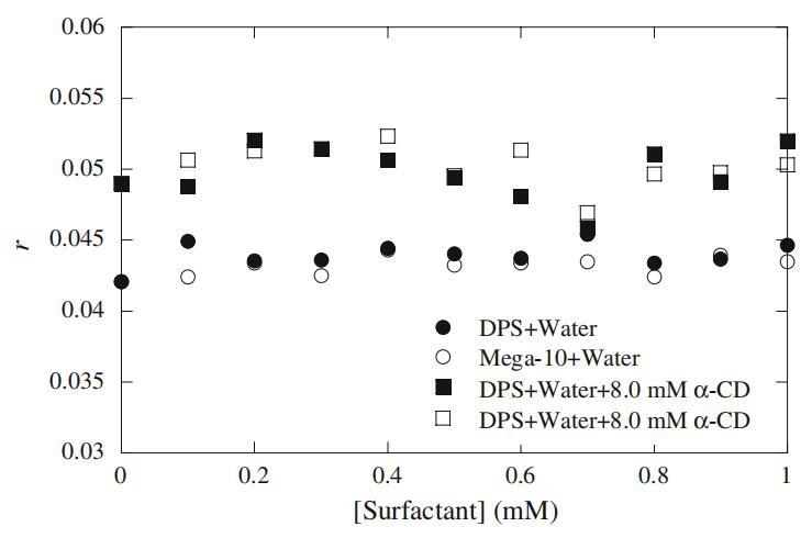 在這項(xiàng)工作中,我們研究了RB與表面活性劑-α-CD-水三元體系的詳細(xì)相互作用,以便系統(tǒng)地研究RB的極化行為。在進(jìn)入膠束介質(zhì)之前,我們排除了RB與水溶液和水溶液α-CD介質(zhì)中前冰層表面活性劑濃度(1 mM)的結(jié)合行為。圖10顯示了在冰層前表面活性劑濃度下,Mega-10和DPS的RB各向異性行為。在水中和存在α-CD(8mm)的情況下,我們未觀察到表面活性劑RB的右旋值有任何顯著變化。從圖10獲得的結(jié)果意味著探針RB不與表面活性劑單體、環(huán)糊精和α-CD表面活性劑包合物結(jié)合。在這些初始測(cè)量之后,我們將我們的實(shí)驗(yàn)方法擴(kuò)展到膠束介質(zhì),以觀察RB的各向異性行為。圖11顯示了純表面活性劑以及Mega-10和DPS二元混合物(15mm)的α-CD(2-8mm)依賴性各向異性行為。從圖11可以得出一些有趣的結(jié)論。首先,圖11清楚地表明,在水介質(zhì)中,純Mega-10的膠束比DPS的膠束具有更高的微粘度。這種行為可以用表面活性劑分子在膠束中的堆積排列來(lái)解釋,表明Mega-10膠束中的堆積比DPS膠束中的更緊密。對(duì)于二元混合物,r值隨著DPS(αDPS)摩爾分?jǐn)?shù)的增加而減小,這表明DPS被誘導(dǎo)到混合膠束中產(chǎn)生的剛性結(jié)構(gòu)較低(參見圖11中最左邊的圖例)。其次,在DPS的每摩爾分?jǐn)?shù)下,r值隨α-CD濃度的增加而線性減小。盡管隨著α-CD濃度的增加,在αDPS=0.0時(shí),r值的下降更為瞬時(shí)。我們注意到,r值的瞬時(shí)降低是由于膠束濃度的降低。為了證實(shí)這一結(jié)果,我們?cè)?0 mM濃度下對(duì)αDPS=0.0(即Mega-10)進(jìn)行了各向異性測(cè)量,圖12中繪制了Mega-10的觀測(cè)r值,并與15 mM濃度下的αDPS=1.0(即DPS)進(jìn)行了比較。正如我們所見,隨著α-CD濃度的增加,Mega-10(20 mM)的r值沒(méi)有瞬時(shí)下降,這表明圖11中r值的急劇下降是由于膠束濃度的降低。DelaCruz等人研究了RB衍生物與陰離子、陽(yáng)離子和非離子表面活性劑的相互作用,并得出結(jié)論,RB衍生物的酯鏈的電荷和長(zhǎng)度控制著與不同膠束系統(tǒng)的相互作用[35]。