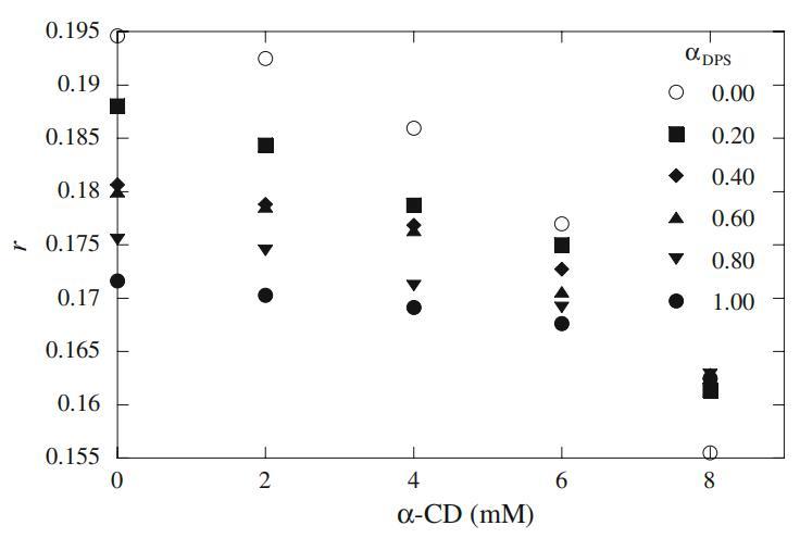 根據(jù)方程式15,我們計(jì)算了在不存在和存在α-CD的情況下當(dāng)前二元混合物的膠束組成(X1)。圖9顯示了混合膠束(X1)和體積摩爾分?jǐn)?shù)(α1)中表面活性劑的組成。從圖9可以得出結(jié)論,在αDPS=0.2時(shí),混合膠束中DPS的組成接近40%。存在α-CD時(shí)的X1值始終低于水的X1值。這種行為可能反映出α-CD通過(guò)降低其結(jié)合最強(qiáng)的表面活性劑的量來(lái)改變成分(見Ka值)。一般來(lái)說(shuō),CDs不與膠束相互作用,但CDs可能通過(guò)與溶液中的表面活性劑相互作用影響膠束的組成,從而改變膠束的平衡和組成。熒光各向異性為了研究混合膠束中兩種不同組分的行為,我們還使用RB作為熒光探針進(jìn)行了偏振熒光測(cè)量。這種探針在膠束介質(zhì)中已經(jīng)得到了很好的表征[33]。探針熒光發(fā)射的去極化程度是其激發(fā)態(tài)壽命期間旋轉(zhuǎn)擴(kuò)散的度量。熒光各向異性(r)通過(guò)Perrin方程與探針周圍的粘度相關(guān),如下[34]: