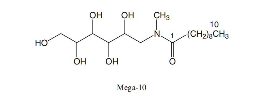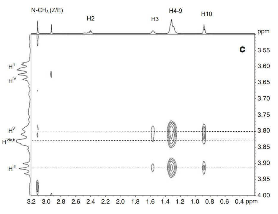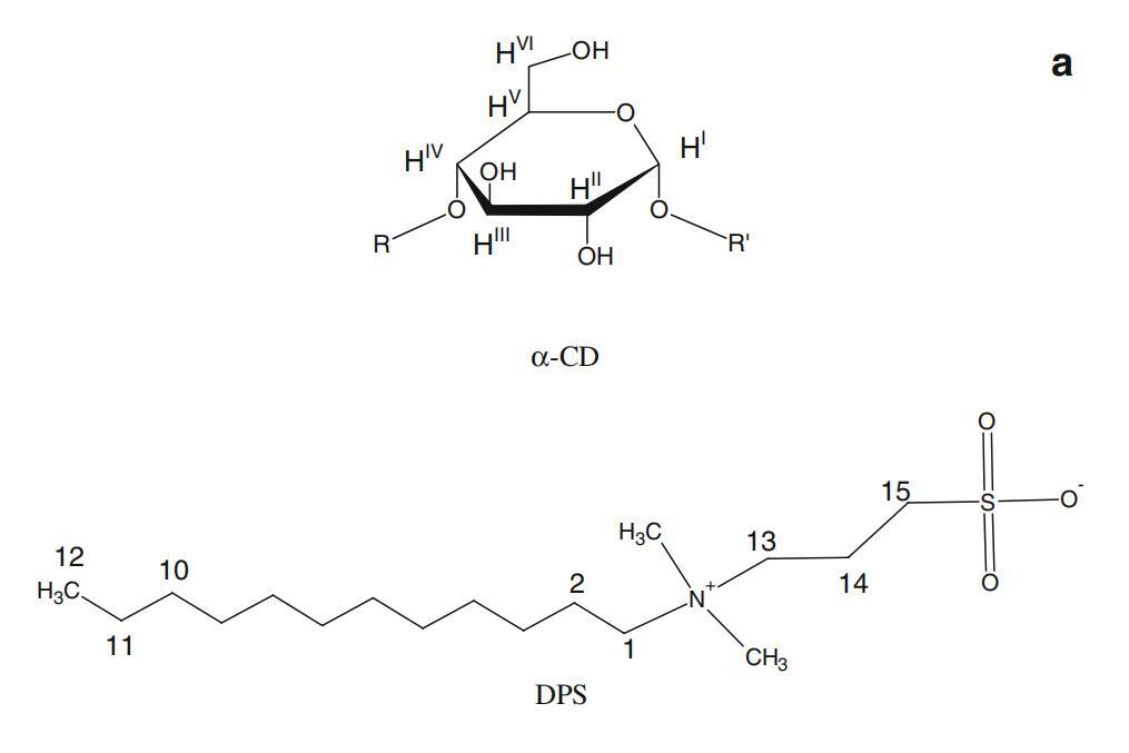 圖7a顯示了α-CD、DPS和Mega-10的示意圖,以簡(jiǎn)化表面活性劑原子與CD原子的相互作用。2DROESY數(shù)據(jù)證明表面活性劑的烷基鏈包含在α-環(huán)糊精的疏水腔中。光譜如圖7b和c所示。可以看到表面活性劑共振與位于環(huán)糊精空腔內(nèi)的HIII、HV和HVI共振的交叉峰。未觀察到分子(HI、HII和HIV)外部與環(huán)糊精原子的相互作用。對(duì)于這兩種表面活性劑,與HIII和HV的相互作用似乎覆蓋了從末端甲基到H3的整個(gè)烷基鏈。這意味著幾個(gè)不同的復(fù)雜幾何形狀和穿透深度之間的快速交換。在鎘原子和親水性頭基之間沒(méi)有觀察到相互作用。