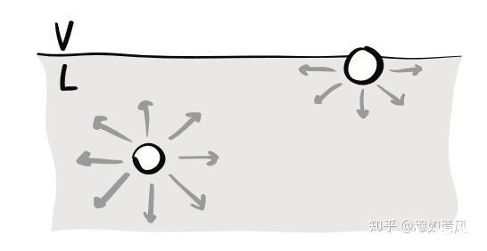 即,對于體相中的分子,其所受斥力在各方向均等大反向;而對于位于表面的分子,粒子之間的排斥力從(氣相中的)忽略不計,在經(jīng)過幾個分子層后,迅速增加到體相的強度。在這一增加過程中,由于排斥力的各向同性本質(zhì),其在任一位置的強度在各個方向是一樣的。
