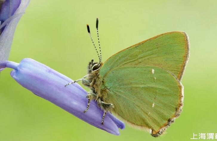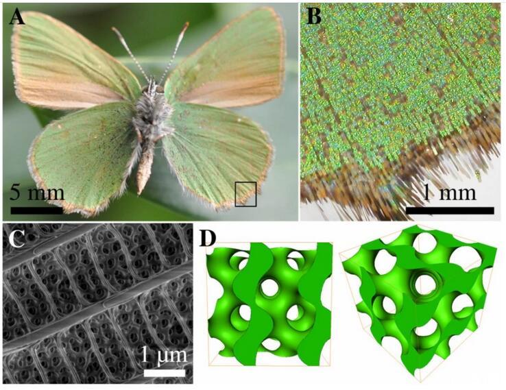 有些種類的蝴蝶,例如歐洲的黃星綠小灰蝶(green hairstreak,Callophrys rubi)和寬絨番鳳蝶(emerald-patched cattleheart,Parides sesostris),其翅膀鱗片上就有一種周期性極小曲面——螺旋二十四面體(gyroid)。從曲面的凸起處和從其他結(jié)構(gòu)處反射回來的光波之間會發(fā)生干涉,波長的變化也就意味著顏色的消失或出現(xiàn)。這就是翅膀鱗片產(chǎn)生顏色的特別技巧。