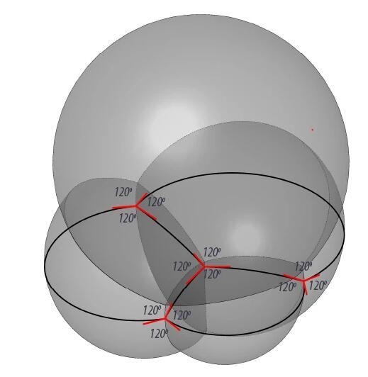 現(xiàn)在我們知道了表面張力決定泡泡的連接方式,泡沫總會找到一種具有最小表面張力的結(jié)構(gòu),也就是使總表面積最小的結(jié)構(gòu)。但是,關(guān)于泡沫的結(jié)構(gòu)還需要考慮另一個問題,即力學(xué)上的穩(wěn)定。在連接點處,沿著不同方向的作用力必須達(dá)到平衡。無論是泡泡筏的平鋪還是泡泡堆的四面相連,都是能滿足這一要求的連接方式。