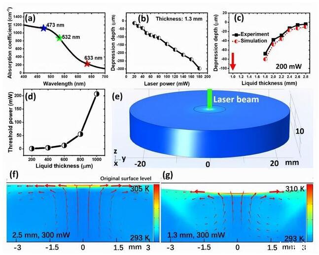 為了探索該光致液體宏觀形變的機(jī)理,王志明團(tuán)隊(duì)通過COMSOL(Comsol Multiphysics,多物理場)仿真,首次系統(tǒng)性地研究了影響光致液體下凹形變的多個(gè)物理參數(shù),并優(yōu)化了液體最大形變的條件。