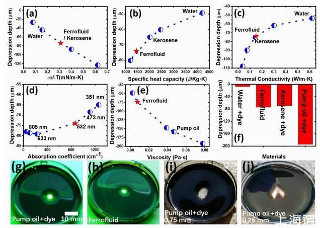 他們發(fā)現(xiàn),液體的厚度、表面張力的溫度系數(shù)、熱導(dǎo)、比熱容、吸光性和粘度等物理參數(shù),都會(huì)對光致液體形變產(chǎn)生重要影響,尤其是吸光系數(shù)和液體的表面張力溫度系數(shù)。