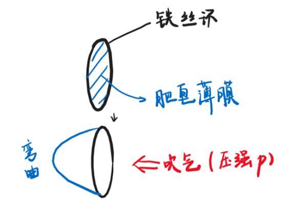 這時,咱們在一側(cè)吹氣(相當(dāng)于施加了一個壓強(qiáng)),平整的薄膜就發(fā)生“彎曲”——