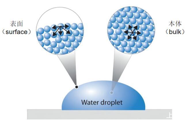 但是,表面的出現(xiàn),使得一些分子變得不同,它們的外側(cè)是氣體或真空,幾乎沒有作用力,這使得表面上的分子“很不安分”,產(chǎn)生了額外的能量——表面能。
