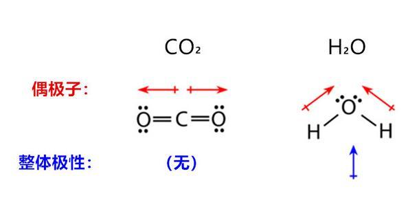 如果分子是由兩個以上原子組成,在確定分子是極性還是非極性時,還必須考慮分子的幾何形狀。下圖顯示了二氧化碳分子與水分子之間的比較,二氧化碳是線性分子,偶極子因強度相同方向相反而互相抵消,對外顯示整體分子的極性為零;水分子的兩個極性鍵有夾角,因此整體對外顯示出極性。