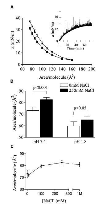 圖1:。NaCl對PIP2單分子膜的擴張效應。(A)π-含0 mM(9)和250 mM NaCl(2)的等溫線;(插圖)亞相注入250 mM NaCl(時間)0時,恒定面積/分子的表面壓力變化。(B)在pH 1.8(n)7)和pH 7.4(n)5)條件下,30 mN/m的每個分子的面積。(C)對亞相NaCl的劑量反應。誤差條為平均值(n處為SE)5,除非另有說明。所有數據均為HEPES緩沖亞相的L-R PIP2,pH 7.4(除非另有說明),30°C。