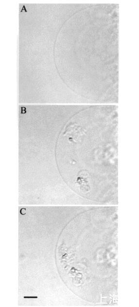 然后我們研究了顳葉素L對巨大脂質體的影響。圖7所示的圖像序列說明了由于temporin L引起的SOPC巨大脂質體的轉化。有趣的是,大約12 amol temporin L(1次注射)已經影響了SOPC膜的外觀,在添加肽后1秒內,巨大囊泡內出現聚集結構(圖7,面板B)。此外,相鄰的巨大囊泡也受到類似囊泡形成的影響(圖7,面板B,研究的巨大脂質體下方)。進一步添加temporin L(最多≈0.12 fmol,共10次重復注射)不會誘導進一步的囊泡形成,而兩個“內吞”聚集體粘附在肽微注射部位的巨大脂質體表面。大約5分鐘后,這兩個“內吞”聚集體粘附在一起,在巨大囊泡內形成一個更大的聚集體結構(圖7,面板C)。與顳葉素L對SOPC巨脂質體的作用類似,該肽在POPG(XPOPG)0.10存在下誘導類內吞過程,圖8)。更具體地說,在添加約12 amol的temporin L(1次注射)后,暴露于肽的巨大脂質體表面的區域變暗,顯示折射率的顯著變化,并指示形成緊密堆積的三維結構,僅部分保留在焦平面中(圖8,面板B)。在內部≈1秒后,巨大脂質體內出現了小顆粒聚集體和暗區(圖8,面板C)。同時,還觀察到相鄰巨大囊泡中的囊泡形成(圖8,圖B和圖C)。隨后總共增加了≈24阿米爾的顳葉素L(2次注射)使另一組“內吞”小顆粒出現在巨大脂質體內,與先前形成的聚集體粘附(圖8,面板D)。之后≈1分鐘,其中一些顆粒(φ≈8μm)從巨大脂質體內的雙層釋放(數據未顯示)。有趣的是,在進一步添加約12 amol的Temporain L(總共3次注射)后,分離的小顆粒再次聚集,暗區的面積增加(圖8,面板E)。暗區面積的增加通過添加另一個≈24 amol temporin L(共5次注射)。幾分鐘后,聚集的“內吞”小顆粒進入巨大囊泡的內腔,而膜表面的暗區消失(圖8,面板F)。同時觀察到相鄰的巨大脂質體的囊泡形成。有趣的是,在膽固醇(Xchol)為0.10的情況下,需要更多的時間蛋白L來誘導囊泡形成(圖9)。然而,在添加約0.24 fmol(20次注射)的Tempolin L后,小顆粒的“內吞”聚集物以及≈巨大脂質體內出現直徑為9μm的顆粒(圖9,面板B)。隨后添加≈0.24 fmol的肽(共40次注射)在巨大囊泡內誘導另一組小顆粒,約30秒后與第一個聚集物合并(數據未顯示)。然而,隨后進一步添加temporin L(高達約1.2 fmol,100次注射)對巨大脂質體膜沒有進一步的可見變化。