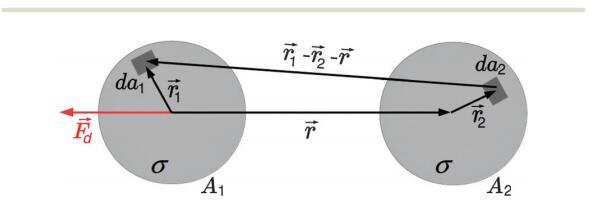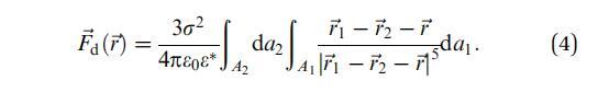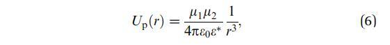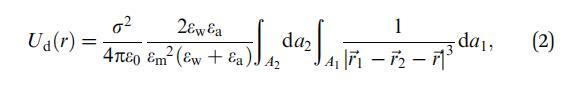 其中Ai表示域i的面積,dai表示其面積元素,-ri表示其相對于域中心的位置向量,i=1,2-r是從域1中心到域2中心的向量,如圖1所示。e0是真空介電常數,ew和ea分別是水和空氣的相對介電常數。在這里,我們使用了Urbakh等人21的研究結果,該研究描述了由兩個半無限介質包圍的薄電介質層中偶極子之間的相互作用。