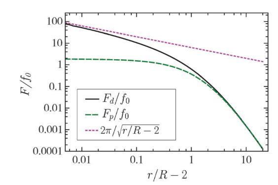 圖2顯示了兩個半徑相等的圓形區域的Fd(r)(實線)和Fp(r)(虛線)。疊加在等式(4)的數值解上,我們添加了等式(5)(虛線)的短距離的漸近表達式。注意,當兩個域接近接觸(r=2R)時,Fd發散,而Fp保持有限。此外,對于實驗感興趣的范圍2R o r o 10R,兩個力之間的差異是可觀的。特別是,即使r=5R,差值也在15%左右。
