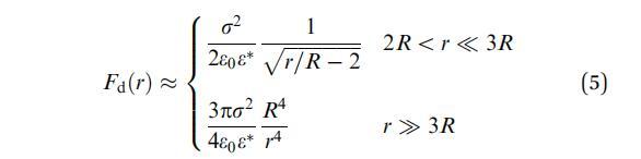 該力沿中心線分布,其大小僅取決于域之間的距離r。Fd(r)沒有解析表達式,因此必須進行數值計算。然而,對于單分散系統的特殊情況(所有域半徑等于R),Wurlitzer等人22發現該力的漸近行為為: