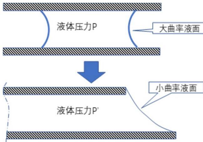 但是當我們向著玻璃縫隙滴幾滴水,哪怕只是很少的幾滴,它們之間就不再牢固了,隨著水的不斷滴入,最后就不可避免地分開了。這是因為滴入水不斷進入縫隙,最后就會破壞掉前面所述的曲率很大的液面,導致液體壓力與外界氣壓的差迅速降低,于是它們就無法繼續沾在一起了。這個過程可以圖示如下: