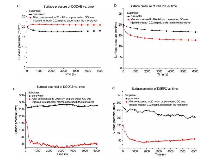 圖2:(a)DODAB和(b)DSEPC單層的表面壓力與經(jīng)過時間。(c)DODAB和(d)DSEPC單層的表面電位與經(jīng)過時間的關(guān)系。黑色曲線:在純水亞相上將單層壓縮至20 mN/m的表面壓力。紅色曲線:將單層壓縮至20 mN/m后,小心地將600μL 1 mg/mL GO分散液緩慢注入單層下方的水亞相中,使GO達(dá)到0.02 mg/mL。
