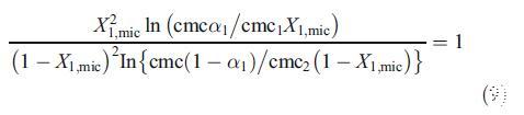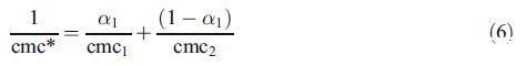 為了討論由兩種二元混合物形成的混合膠束的性質(zhì),即混合膠束是否顯示理想或非理想行為,我們使用了偽相分離模型[19]。根據(jù)該模型,膠束被認(rèn)為是與含有相應(yīng)單體的溶液平衡的宏觀相。對于二元表面活性劑混合物,理想cmc由方程[19]關(guān)聯(lián):