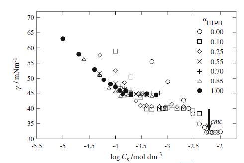 圖1界面張力γ與log Cs/mol dm的關(guān)系圖?3.對于HTPB+Mega-10混合體系,在不同α