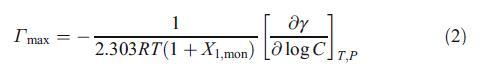 其中γ、C、R、T、P和X1、mon分別為界面張力、表面活性劑濃度、理想氣體常數(shù)、溫度、壓力和陽離子表面活性劑(HTPB)的單層組成。在等式2中,我們考慮了界面處反離子的吸附,以計算Γmax。界面上表面活性劑物種占據(jù)的平均最小面積Amin然后通過以下方程進行評估: