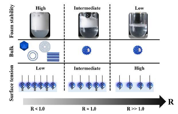 圖6.說明摩爾比(R)、泡沫穩定性、本體自組裝和表面性質之間聯系的示意圖。