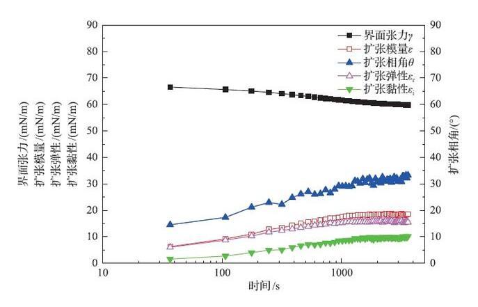 表面活性劑溶液的動(dòng)態(tài)界面張力、擴(kuò)張模量、擴(kuò)張相角、擴(kuò)張彈性和擴(kuò)張黏性隨時(shí)間變化曲線
