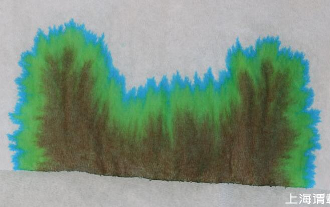 墨水從紙巾的下端浸入,按照擴散速度不同,被分成了最慢的棕色,中間的綠色和最快的藍色。其實最最外層還有無色的液體,干了之后圖里面看不見了