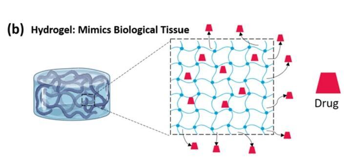 水凝膠是通過物理或化學交聯方法形成的三維聚合物網格。網格之間留有一定的空間,由于該網格的存在,水凝膠的結構富含多孔性。聚合物網格可以截留大量的水,并防止其運輸到外部環境,從而模仿生物組織的物理特性。這種保水能力,使水凝膠能夠提供良好的生物相容性和封裝藥物分子的平臺。該網格可以限制不同酶的滲透,從而保護包封的藥物免受各種酶降解。