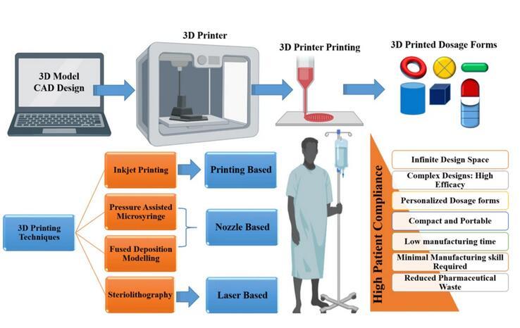 3D打印技術中不需要造粒、壓片以及包衣等環節,并且可以靈活控制藥物的劑量以及釋放,所以該技術逐漸發展起來。3D打印技術主要有選擇性激光燒結(SLS)、光固化成型(SLA)、熔融沉積成型(FDM)、半固體擠出成型(SSE)以及噴墨成型打印(IJP)等方式。3D打印藥物目前的代表藥物,為FDA批準的Spritam。