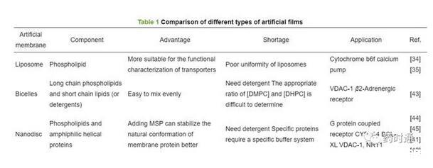 與雙胞體一樣,納米盤的第一步是基于洗滌劑的增溶,需要優(yōu)化所使用的洗滌劑的性質(zhì)和濃度,這在納米盤重組中可能造成蛋白質(zhì)活性損失,因此同樣存在洗滌劑使用相關(guān)問題的限制。表1[34,35,41-45]比較了脂質(zhì)體、雙胞體、納米盤的組成及其優(yōu)缺點(diǎn)。
