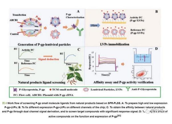 針對(duì)慢病毒載體穩(wěn)定技術(shù)結(jié)合SPR在中藥活性成分篩選中的應(yīng)用,本課題組已展開一些探索性研究。P-糖蛋白(P-gp)是體內(nèi)最重要的外排型轉(zhuǎn)運(yùn)蛋白,具有12次跨膜的復(fù)雜結(jié)構(gòu),且尚未商品化。Cao等[80]采用LVPs穩(wěn)定策略,獲得活性良好的P-糖蛋白,構(gòu)建了一種基于SPR的P-糖蛋白配體篩選系統(tǒng)。首先,獲得P-gp高表達(dá)和低表達(dá)的LVPs,然后將P-gp高/低表達(dá)的LVPs分別固定在CM5芯片上作為活性通道和參比通道。以P-gp抑制劑伐司樸達(dá)(valspodar,Val)和環(huán)孢素(cyclosporin,CsA)為陽性對(duì)照,從天然產(chǎn)物庫中快速篩選出厚樸酚、和厚樸酚和白藜蘆醇作為潛在的P-gp配體(圖4)[80]。Chen等[81]構(gòu)建了CXCR4的配體篩選體系,將高/低表達(dá)的CXCR4的慢病毒顆粒固定在CM5芯片上,以趨化因子受體拮抗劑AMD3100為陽性化合物,從川芎提取物中篩選出洋川芎內(nèi)酯Ⅰ為CXCR4的潛在配體。