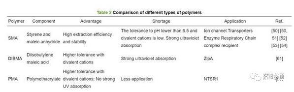 盡管SMA和DIBMA在一些MPs的分離純化中取得了成功[63],但存在SMA對(duì)二價(jià)陽離子耐受性低、DIBMA提取純度和穩(wěn)定性低的缺陷并且這兩種聚合物都有強(qiáng)烈的紫外吸收,可能干擾紫外檢測(cè)[57]。因此人們開始尋找非“烯烴-馬來酸支架”替代聚合物。最近,兩親性聚甲基丙烯酸酯聚合物(polymethacrylate,PMA)被證明可將脂質(zhì)雙分子層溶解成納米圓盤。PMA比常見的苯乙烯-馬來酸聚合物具有潛在的優(yōu)勢(shì),但目前PMA對(duì)于MPs的純化應(yīng)用較少[64]。Lavington等[63]以神經(jīng)緊張素受體1(NTSR1)為對(duì)象,探索使用PMA的無洗滌劑純化。通過使用Sf9細(xì)胞中表達(dá)的NTSR1-eGFP融合蛋白,篩選了一系列的增溶條件,證明了溫度、pH、NaCl濃度以及聚合物和膜樣品的相對(duì)數(shù)量的重要性。此外還發(fā)現(xiàn)PMA對(duì)二價(jià)陽離子有一定耐受性。PMA溶解的NTSR1比洗滌劑溶解的NTSR1表現(xiàn)出更大活性,這表明PMALPs為NTSR1提供了更天然的膜環(huán)境[63]。因此,PMA是一種可替代SMA的MPs純化方法,在研究NTSR1和其他MPs方面具有良好的前景。表2比較了SMA、DIBMA、PMA的組成、優(yōu)缺點(diǎn)及其應(yīng)用。