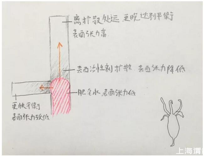 低表面張力的液體滴到高表面張力的液體當(dāng)中,由于表面張力不平衡,就會(huì)帶動(dòng)液體向表面張力高的一邊流動(dòng),這種現(xiàn)象被稱為Marangoni效應(yīng)。因?yàn)槲业瘟吮容^多的液體進(jìn)去,藍(lán)色液體前進(jìn)的動(dòng)力肯定不只是表面張力,但這個(gè)因素對(duì)液體“選路”非常重要。