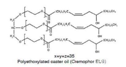 另一類重要的非離子表面活性劑是聚氧乙烯蓖麻油(Cremophor)或聚氧乙烯氫化蓖麻油(Cremophor RH)。蓖麻油是蓖麻油甘油三脂,與環(huán)氧乙烯反應(yīng),親水性的氧化乙烯結(jié)構(gòu)便插入到蓖麻酸和甘油之間,便得到了聚氧乙烯蓖麻油,如果蓖麻油中的雙鍵加氫飽和后,再與環(huán)氧乙烯反應(yīng),那么得到的便是聚氧乙烯氫化蓖麻油。環(huán)氧乙烯和蓖麻油的反應(yīng)位點是隨機的,因此得到的表面活性劑是一種混合物,也包括未反應(yīng)的蓖麻油和均聚形成的聚氧乙烯。不同種類的聚氧乙烯蓖麻油或聚氧乙烯氫化蓖麻油是通過參與反應(yīng)的氧化乙烯和蓖麻油或氫化蓖麻油的比例決定的,例如Cremophor EL 40或Cremophor RH 40,其中40代表的便是混合物中氧化乙烯和蓖麻油的摩爾比。這類表面活性劑的HLB一般在12以上,常用作難溶性藥物的增溶。