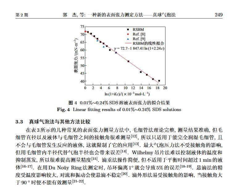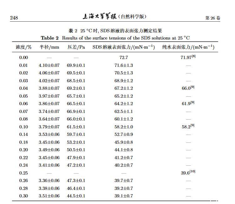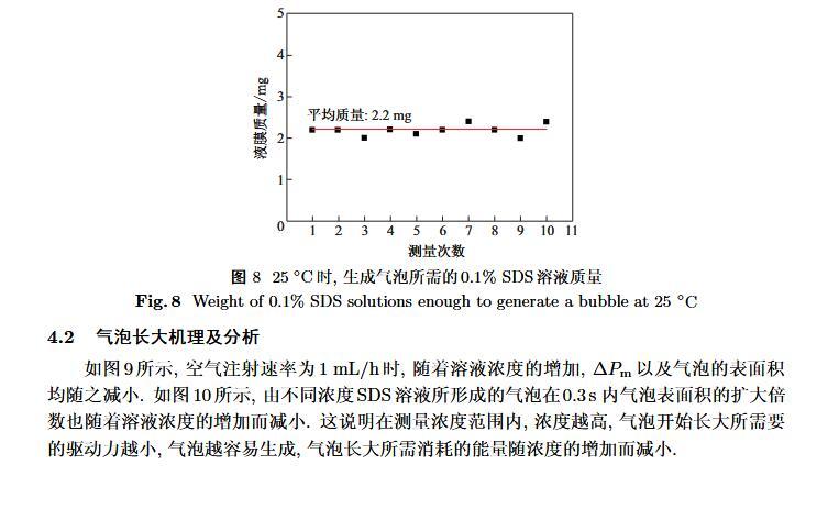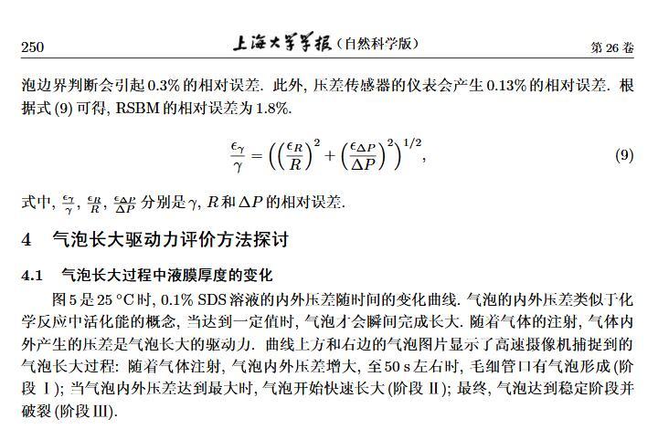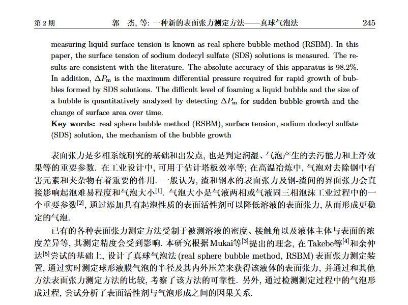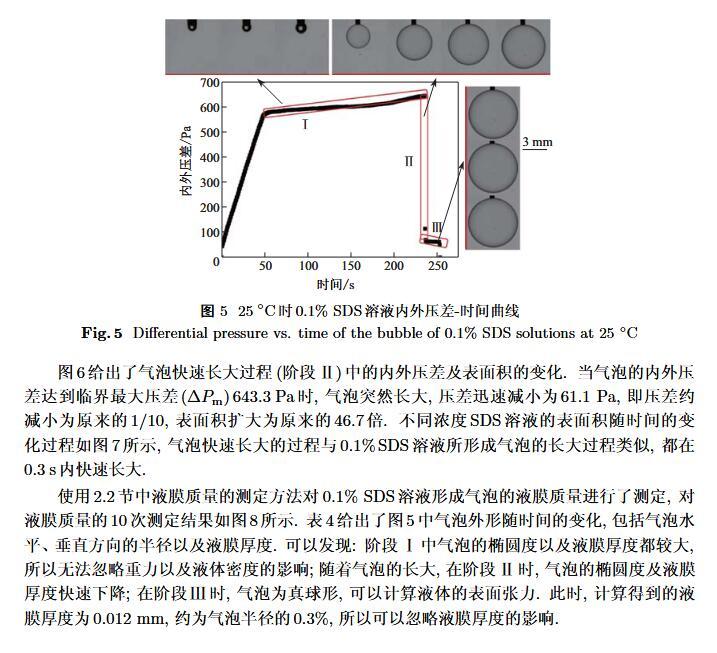 設(shè)計(jì)了一個(gè)新的表面張力測(cè)定裝置,通過(guò)實(shí)時(shí)測(cè)定液膜氣泡的半徑及其內(nèi)外壓差來(lái)獲得被測(cè)液體的表面張力。該測(cè)定液體表面張力的方法簡(jiǎn)稱為真球氣泡法(real sphere bubblemethod,RSBM)。對(duì)十二烷基硫酸鈉(sodium dodecyl sulfate,SDS)溶液的表面張力進(jìn)行了測(cè)定,結(jié)果與文獻(xiàn)值吻合,且測(cè)定裝置的絕對(duì)精度為98.2。通過(guò)檢測(cè)到的液膜氣泡突然長(zhǎng)大所需要的最大壓差值及其表面積隨時(shí)間的變化過(guò)程,定量分析溶液起泡難易程度及氣泡大小的關(guān)系。