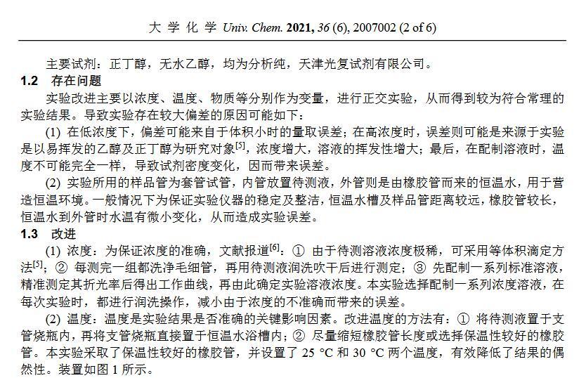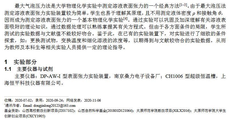 【摘要】:最大氣泡壓力法測定溶液表面張力是物理化學實驗中的一個傳統實驗,由于各種因素的影響,導致學生實驗結果存在較大偏差。本研究通過濃度、溫度等作為變量進行實驗條件探索而得到的結果與文獻值較為吻合。