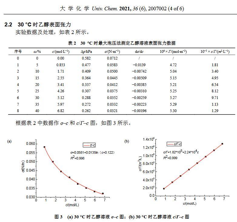 最大氣泡壓力法是大學物理化學實驗中測定溶液表面張力的一個經典方法[1–3]。由于最大泡壓法測定溶液表面張力實驗裝置較為簡單,學生也易于理解其原理,且不用測定液體密度ρ和接觸角θ,因而成為測定溶液表面張力的一個基本物理化學實驗[4]。通過實驗可以鞏固及加深理解有關溶液表面吸附的理論知識,通過數據處理可以熟練掌握其有關方程式。但由于各方面條件的局限,學生所測試的實驗數據與文獻值不能較好吻合。鑒于此,在已有的實驗裝置下,對實驗進行了細致的條件探索,如:更換測試物,變換溫度和細化溶液的濃度等,以期得到與文獻較吻合的實驗數據,從而為教師及本科生等相關實驗人員提供一定的理論指導。