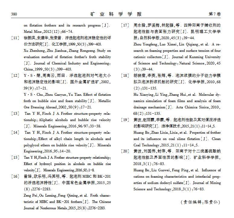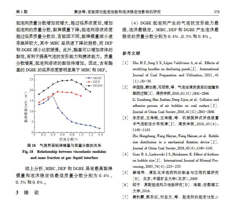 【摘要】:浮選是分離微細(xì)物料的重要方法,起泡劑類型和泡沫穩(wěn)定性顯著影響浮選效果。本文選取醇類(MIBC)、酯類(DEP)和醚醇類(DGBE)三種起泡劑,通過(guò)實(shí)驗(yàn)研究官能團(tuán)對(duì)起泡性能和泡沫穩(wěn)定性的影響。實(shí)驗(yàn)用Foamscan測(cè)定起泡劑溶液的起泡性能和泡沫穩(wěn)定性,用Tracker流變儀測(cè)定表面張力和氣液界面黏彈模量。研究結(jié)果表明:起泡速率隨表面張力的減小呈線性增大,當(dāng)氣液界面吸附起泡劑達(dá)到飽和時(shí)起泡速率最大,其中MIBC的起泡速率最高,DGBE最小;起泡劑濃度為臨界質(zhì)量分?jǐn)?shù)時(shí),起泡能力最大,MIBC、DEP和DGBE的臨界質(zhì)量分?jǐn)?shù)分別為1.1%、0.4%和0.8%;氣泡的大小隨溶液表面張力減小而減小,氣泡平均尺寸由大至小順序?yàn)椋篋GBEDEPMIBC;在泡沫穩(wěn)定性方面,醚醇類起泡劑最強(qiáng),醇類起泡劑最差,同時(shí)MIBC、DEP和DGBE質(zhì)量分?jǐn)?shù)分別為0.4%、0.5%和0.8%時(shí),起泡劑生成的泡沫最穩(wěn)定。