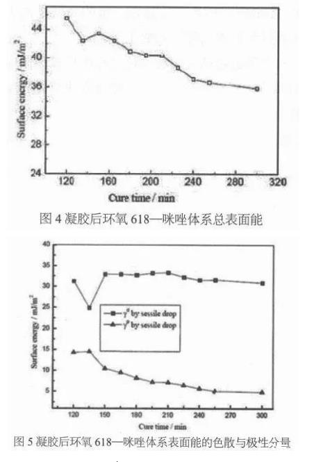 馬全勝通過(guò)研究恒溫固化過(guò)程中環(huán)氧樹(shù)脂體系凝膠后表面能的的變化規(guī)律,結(jié)合固化機(jī)制和反應(yīng)特性,分析環(huán)氧618-咪唑體系表面能的色散分量、極性分量的變化。