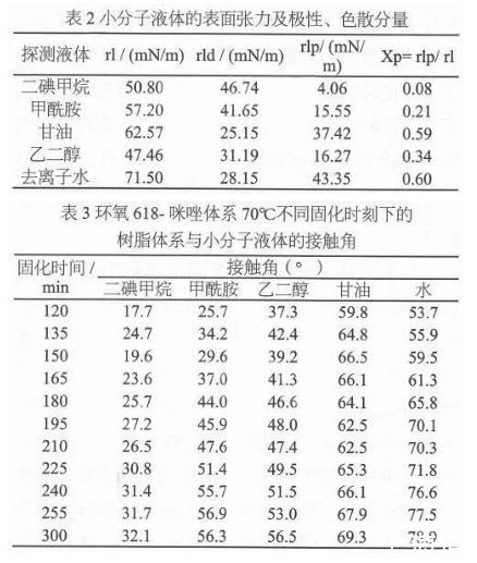 表2為實(shí)驗(yàn)所用小分子液體的表面張力及極性、色散分量,表3為環(huán)氧618-咪唑體系70℃不同固化時(shí)刻下的樹(shù)脂體系與小分子液體的接觸角。